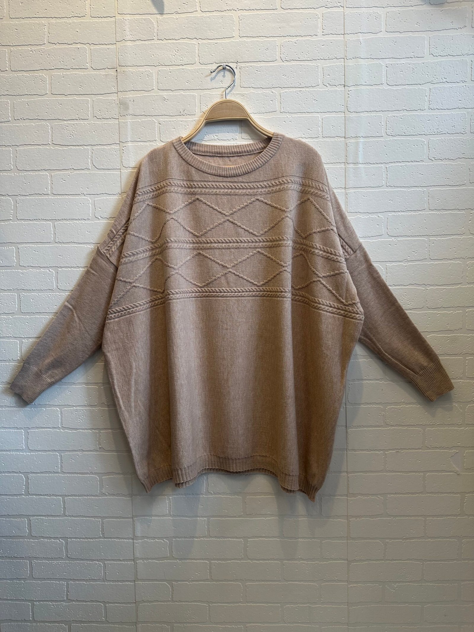 Largo hasta el muslo y tejidos en forma de rombo en el pecho.